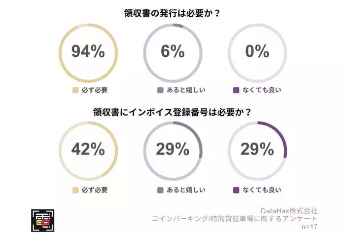 事業用車でコインパーキングを利用される人に「Q.コインパーキング/時間貸駐車場で領収書の発行は必要ですか?」(n=17)と質問したところ、「必ず必要」が94.1%、「あるとうれしい」が5.9%で、「なくても良い」の回答は0%でした。