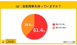 続いて、Q1で「必要」と回答した方に、自家用車を持っているかどうか聞いたところ、「持っている」が61.4%、「持っていない」が38.6%という結果となりました。車を必要だと感じているものの、約4割の方は自家用車を持っていないことがわかります。