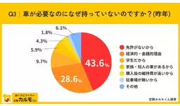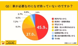続いて、Q2で「持っていない」と回答した方に理由を聞いたところ、最も多かったのは「免許がないから」で45.9%、次いで多かったのは「経済的・金銭的理由」で27.0%でした。昨年と比較すると、主な理由は同じであるものの、「免許がないから」と答えた方の割合が増える結果となりました。