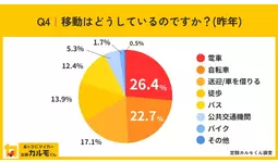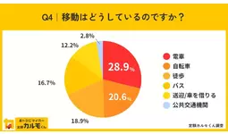 さらにQ2で「持っていない」と回答した方に、移動はどうしているのか聞いたところ、最も多かったのは「電車」で28.9%でした。次いで多かったのは「自転車」で20.6%でした。昨年と比べ、「電車」を利用している方の割合が2.5%増えたほか、「徒歩」を選んでいる方が5%増えていることがわかりました。