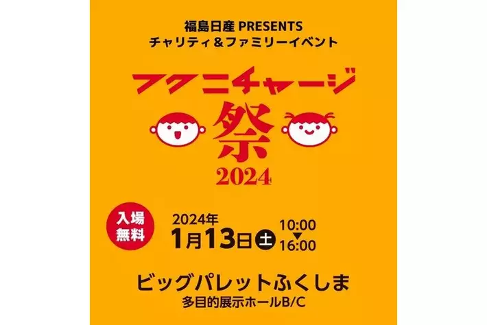 福島日産自動車株式会社(本社:福島県福島市、代表:金子 與志幸)は、福島日産 PRESENTS チャリティ&ファミリーイベント 「フクニチャージ祭2024」を2024年1月13日(土)にビッグパレットふくしまにて開催します。今回もスペシャルゲストや企画が盛りだくさん!収益の一部はフクニチャージこども基金を通して、福島県内で活動している子供支援団体等に寄付をいたします。また1月1日に発生した能登半島地震にも義援金をお送りすることを追加決定しています。今回は福島日産の初売りラストスパート週での開催となるため、会場にも商談ブース・キッズスペースを設け、フクニチャージ祭会場限定 特別ご成約特典もご用意しています。また2024年1月下旬発売予定のNEW日産ノートや「ゆずサクラ」や日産サファリ消防車などの特別車両展示も見どころです!さらにフクニチャージYouTubeチャンネルでは新たなチャレンジとして開場時間中会場からの生配信を行います。