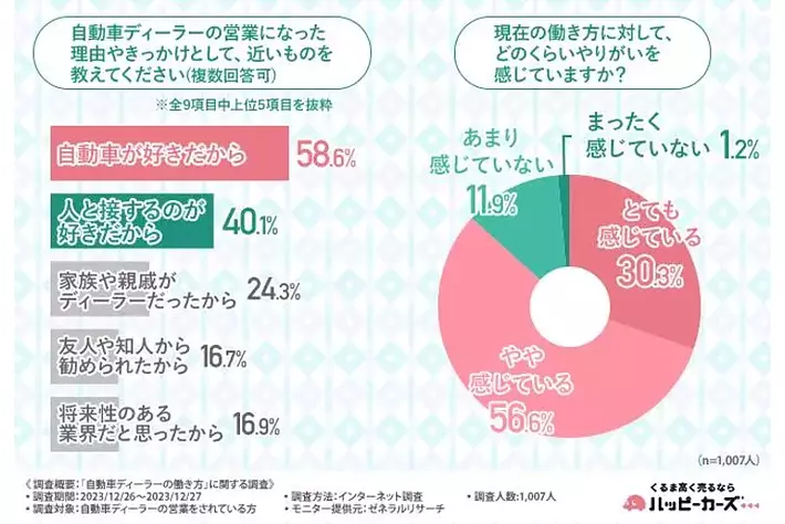 今回の調査で、自動車ディーラーの営業の約9割がやりがいを持って働いていることが明らかになりました。