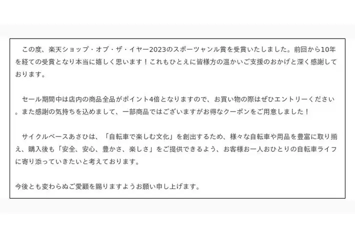 サイクルベースあさひ楽天市場店が楽天ショップ・オブ・ザ・イヤー2023のスポーツジャンル賞を受賞