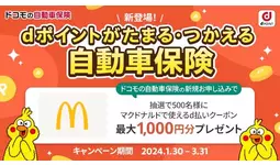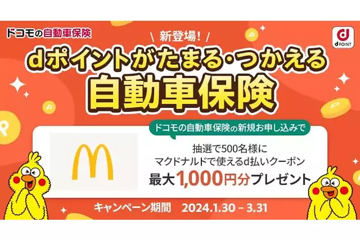 本保険をより多くのお客さまにご利用いただけるよう、提供開始を記念し、条件を満たしたお客さまの中から抽選で500名様にマクドナルドでつかえるd払いクーポンがあたる「ドコモの自動車保険 発売記念キャンペーン」を開催します。キャンペーンの詳細は、別紙2をご確認ください。