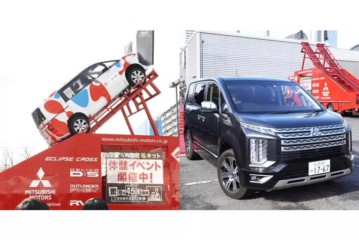 デリカD:5で最大傾斜45度の急坂登坂走行を始め、過酷な路面状況をイメージした走行キットで、三菱車の力強さ&4WD性能を体験しよう。