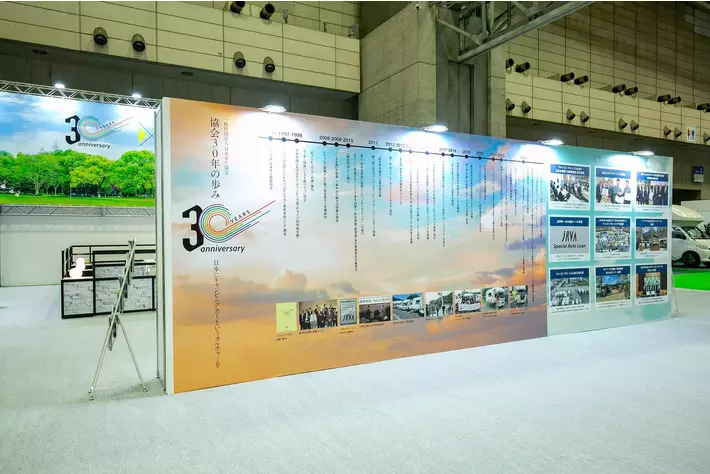 今年JRVAは創立30周年を迎えます。この節目の年に、弊会の出展ブース「JRVAブース」では、「30年のあゆみ」「防災」「地方創生」「製造技術」「RVパーク」など協会の活動や取組を紹介しています。