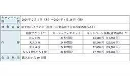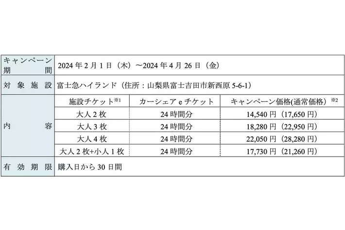 タイムズモビリティ株式会社(本社:東京都品川区、社長:川上紀文)は、2月1日より、富士急ハイランド(所在地:山梨県富士吉田市)の施設チケットとカーシェアリングサービス「タイムズカー」の電子優待券(カーシェアeチケット)を優待価格で販売する「お出かけeクーポン」をオトクに購入いただけるキャンペーンを実施します。