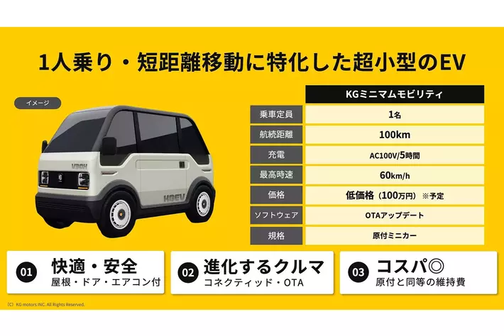 KGモーターズ、開発中の超小型EV「ミニマムモビリティ」試作1台目の完成を発表 - 2025年に300台の量産販売予定