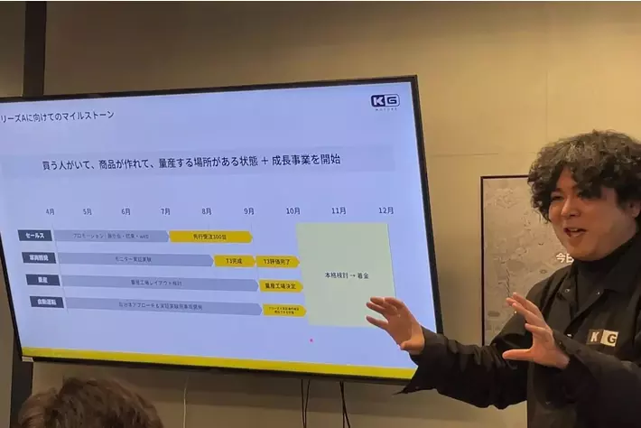 さらに、共同創業者であり取締役の横山文洋からは、量産に向けた資金調達スケジュールや資金使途の共有が行われました。調達のためのマイルストーンも発表され、KGモーターズの成長に向けた戦略的な計画が明らかにされました。