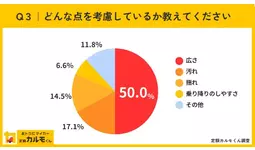 続いて、Q2で「考慮した」と回答した人に、どんな点を考慮しているか聞いたところ、最も多かったのが「広さ」で50.0%でした。具体的には、「車の中で移動できるスペースを考えた」「窮屈さを感じないようにした」など、犬が安心して過ごせるような広々とした空間があるかどうかが決め手となっています。次いで多かったのは17.1%が回答した「汚れ」で、「シートを革張りにしない」「汚れてもいい中古車を選ぶ」といった回答がみられました。「揺れ」と回答したのは14.5%で、「静音性や振動の少なさ」を重視することで、犬が酔わない工夫をしていることがわかりました。
