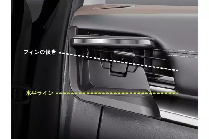 エアコン吹き出し口下のスペースに、付属の取り付けベースを差し込み、ホルダー本体を取り付けます。本体のクリップでエアコンフィンに固定しますが、装着状態でもエアコンフィンを左右に操作することが可能です。(上下操作は不可)