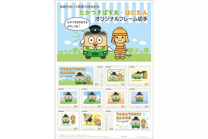 令和6年2月25日に開業70周年を迎えることを記念して、2月25日(日曜日)には現在市内を運行しているいすゞエルガの市営バス記念トミカ、2月26日(月曜日)には市営バスのマスコットキャラクター「たかつきばすお」と高槻市のマスコットキャラクター「はにたん」がデザインされたオリジナルのフレーム切手の販売が開始されます。市営バスのトミカを販売するのは5年前に続いて今回で2回目。前回大好評でしたので、希望の方はお早めにお買い求めください。