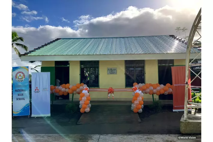 今回の校舎建設支援事業は、子どもの学習環境の改善を目指し、三菱自動車とWVJが連携して実施したものです。支援対象の中学校では教室が不足していたことから、中等学校校舎1校舎1棟を建設し、テーブル付き椅子、プロジェクター、扇風機などの備品・設備を設置しました。同校は、600名を超える生徒が通う地域にとって重要な学びの場となっており、将来的には高等部を併設することを目指しています。今後は、学校とPTAが協力して校舎を維持管理し、生徒、教師たちが大切に使い続けます。