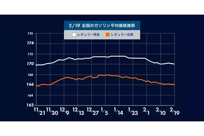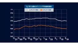 2月19日(月) 時点のレギュラーガソリンの全国平均は、170.1円となり先週と変わらず横ばいとなりました。