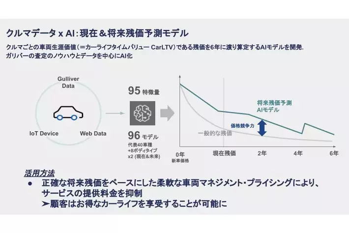 このモデルではクルマごとの車両生涯価値、通称カーライフタイムバリュー(CarLTV)の算出において最も重要な構成要素である残価を6年にわたり高精度に算定し、その結果を元にお客様に様々な新価値を提供します。