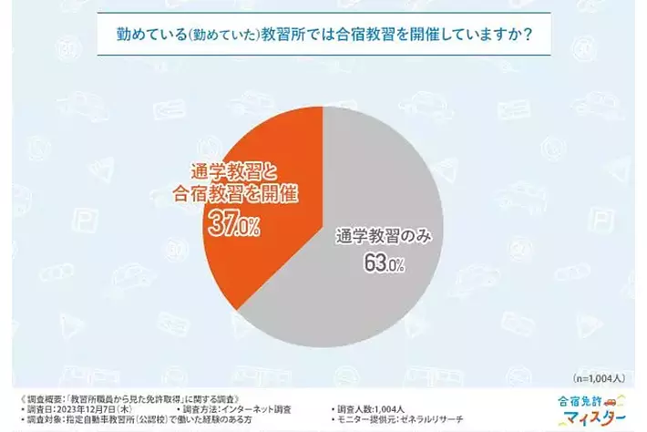 はじめに「勤めている(勤めていた)教習所では合宿教習を開催していますか?」と質問したところ、『通学教習のみ(63.0%)』『通学教習と合宿教習を開催(37.0%)』という回答結果になりました。