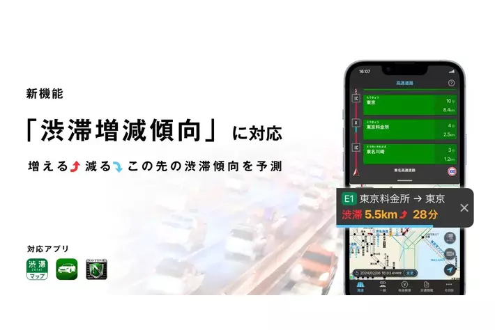 株式会社ナビタイムジャパン(代表取締役社長:大西 啓介、本社:東京都港区)は、2024年2月21日(水)より、リアルタイムの道路交通情報に特化したアプリ『渋滞情報マップ by NAVITIME』、カーナビアプリ『NAVITIMEドライブサポーター』、『カーナビタイム』にて、現在発生している高速道路上の渋滞の増減傾向の予測情報を提供開始いたします。