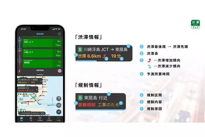 『渋滞情報マップ by NAVITIME』では、今回新たに追加する「道路情報板」機能にて、直近の渋滞や規制情報と合わせて画面上に表示し、『NAVITIMEドライブサポーター』、『カーナビタイム』では、走行中の音声発話にて案内します。