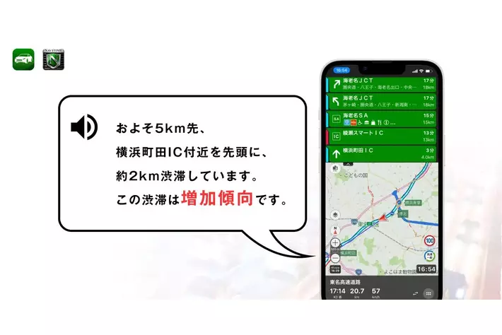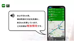 走行中に、直近の渋滞・規制情報に加え、その渋滞の増減傾向について「およそ5km先、横浜町田IC付近を先頭に、約2km渋滞しています。この渋滞は増加傾向です。」のように発話するようになります。