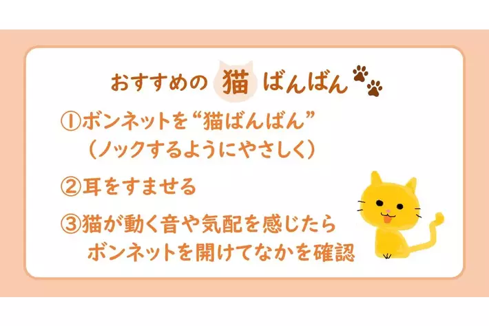 なお、ボンネットを叩くいわゆる“猫ばんばん”は有効ですが、万能ではありません。叩いて出てくるかは個猫差があります。叩いたあと猫の声や気配を感じたらボンネットを開け、中まで確認してください。