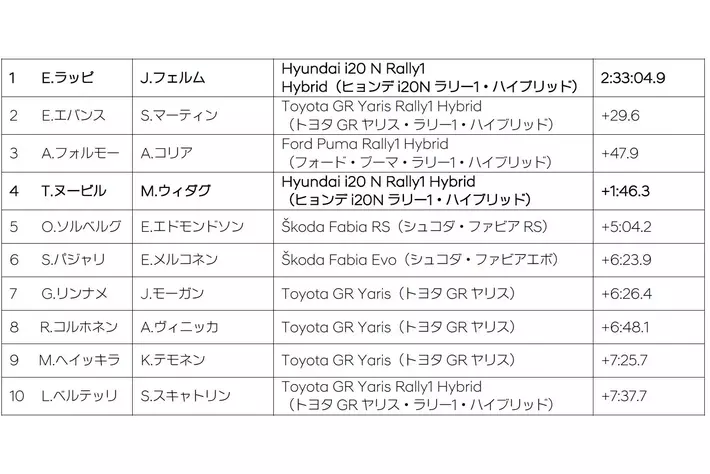 エストニア出身のオィット・タナックと Martin Jarveoja(マルティン・ジェルペオジャ)は金曜日のリタイアから回復し、新しいスコアシステムで4ポイントを獲得して日曜日を4位で終えました。土曜日、Hyundai i20 N Rally1 Hybrid 8号車は、不利な状況にも関わらず、トップを目指して走行し、オープニングテストでの勝利を含め、この日は3本のステージのタイムがトップ3に入りました。Hyundai Shell Mobis World Rally Team所属の2人は、パワーステージでさらに2ポイントを獲得して大会を終えました。