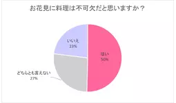 次に、「お花見に料理は不可欠だと思いますか?」と質問すると、半数が「はい」と答え、27%の方が「どちらとも言えない」、23%の方が「いいえ」と回答しました。