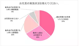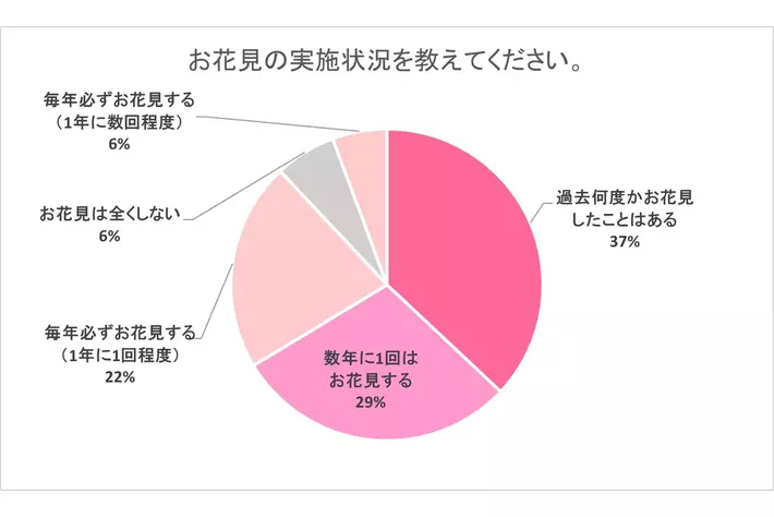 また、お花見の実施状況を質問すると、「過去何度かお花見したことはある」が37%で最も多く、次に「数年に1回はお花見する」が29%、「毎年必ずお花見する(1年に1回程度)」が22%と続きます。