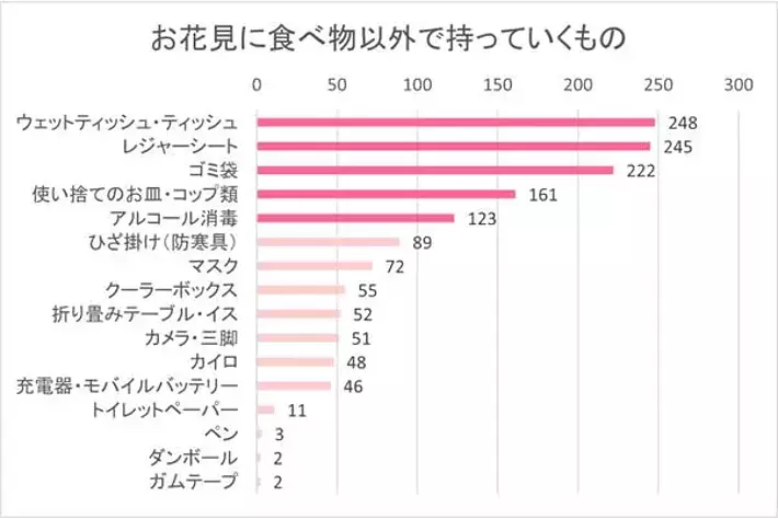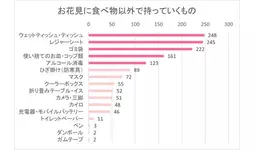 次に、お花見に食べ物以外で持っていくものをお聞きすると、「ウェットティッシュ・ティッシュ」が248票と最多で、続いて「レジャーシート」が僅差で245票、「ゴミ袋」が222票という結果でした。