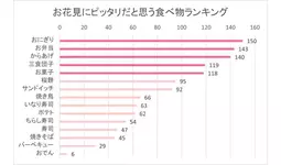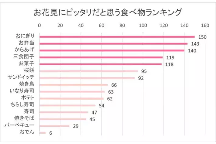 お花見にピッタリだと思う食べ物をお聞きすると、1位が「おにぎり」で150票、2位が「お弁当」で143票、3位が「からあげ」で140票と、上位3位は食事メニューが占める結果でした。