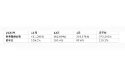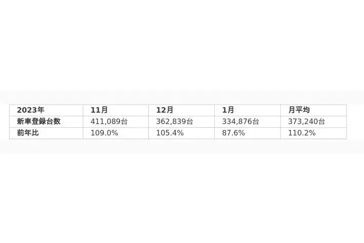 2024年1月の新車登録台数は前月比92.3%、中古車登録台数は前月比89.4%となりました。1月はどちらも前月比90%程度と、新車・中古車で似たような変動を見せています。