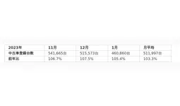 前年比を見てみると、新車登録台数は前年比87.6%、中古車登録台数は105.4%となっており、2022年9月から常に増加していた新車登録台数が前年比マイナスとなっています。こちらは大手メーカーの不正発覚に伴う特定車種の出荷停止が影響していると考えられます。ただしすでに出荷停止指示が解除されている車種も多くあるため、2月以降の新車登録台数は徐々に回復する見込みとなっています。