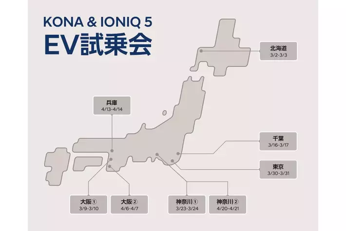 Hyundai Mobility Japan株式会社(本社:神奈川県横浜市西区、代表取締役社長:趙源祥、以下Hyundai)は、2024年3月2日(土)より、6都道府県にて新型EV「KONA(コナ)」と「IONIQ 5(アイオニックファイブ)」の試乗会を開催いたします。