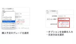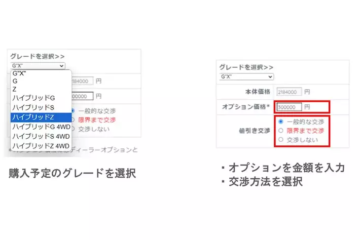 グレードとオプション金額を入力し、購入者は自分の交渉スタイルに合わせて「一般的な交渉」、「限界まで交渉」、または「値引きしない」を選択します。