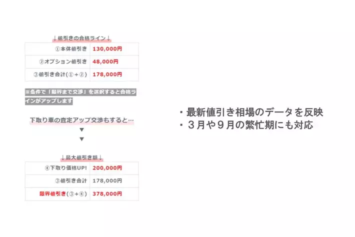 この選択に基づいて、その車種に見合った妥当な値引き額が瞬時に提供されるので、交渉時の透明性が増し、購入者はディーラーとの交渉に自信を持って臨むことができます。