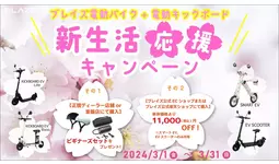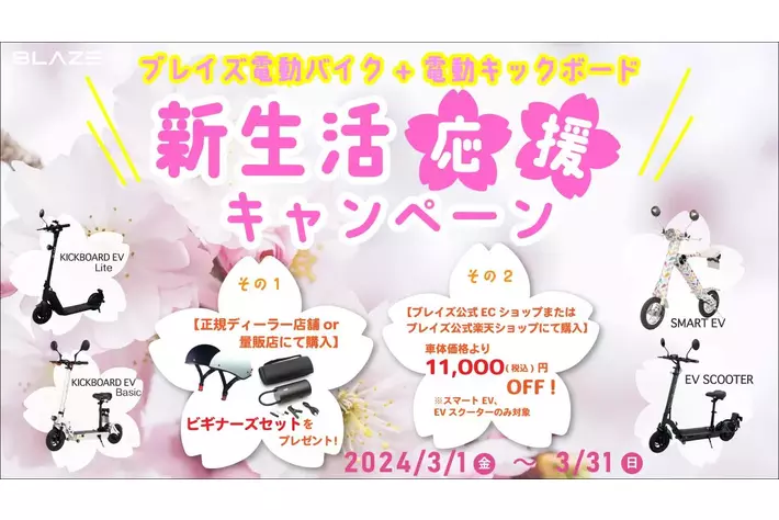 株式会社ブレイズ(愛知県名古屋市、代表取締役:市川秀幸、以下ブレイズ)は、2024年3月1日(金)~3月31日(日)の期間、ブレイズの電動バイク&電動キックボードを対象とした「新生活応援キャンペーン」を実施いたします。