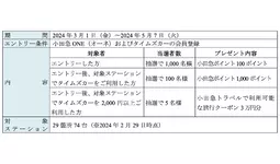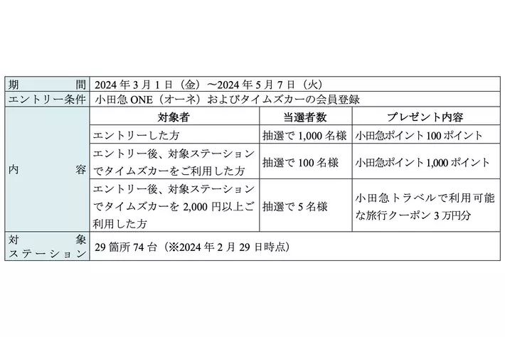 この度のキャンペーンは、より多くの方に鉄道とカーシェアリングを組合せた移動の利便性を体験いただきたいという思いから、小田急沿線の対象ステーションでタイムズカーをご利用された方などに「小田急ポイント」や旅行クーポン3万円分を抽選でプレゼントするものです。