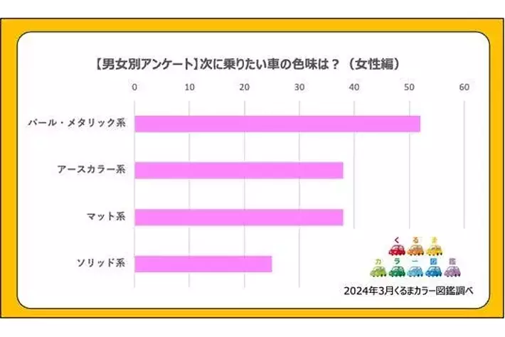 一方女性はパール・メタリック系が1位ではありますが、男性との大きな違いでアースカラーの人気が高いです。おしゃれに敏感な女性ならではの結果ですね。