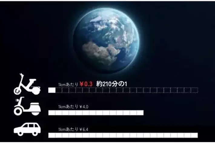 経済的効果: 電動化によるCO2排出量の削減を実現し、かつ走行に必要な電力量を費用で算出すると原付のおよそ210分の1のコストで走行することができます。