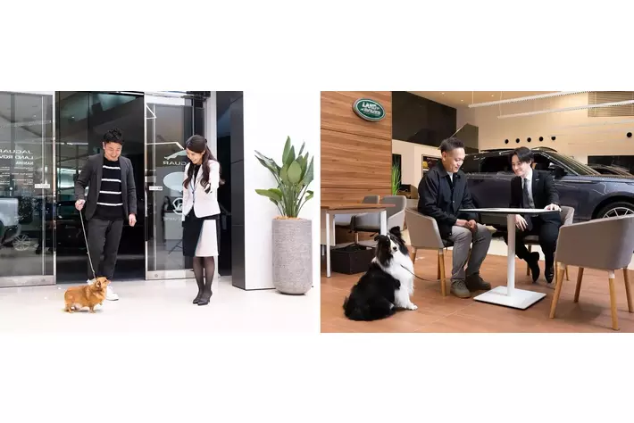 八光のショールームでは2024年1月より「ドッグフレンドリー宣言」と称し、犬連れのお客さまにもご入店いただける体制づくりを整えてまいりました。これは、愛犬家のお客さまからの「犬と一緒にクルマ選びがしたい」という要望に応えたものです。