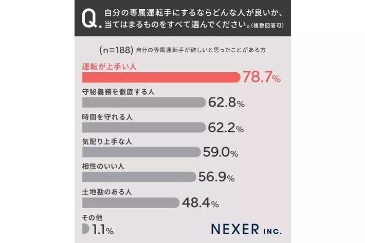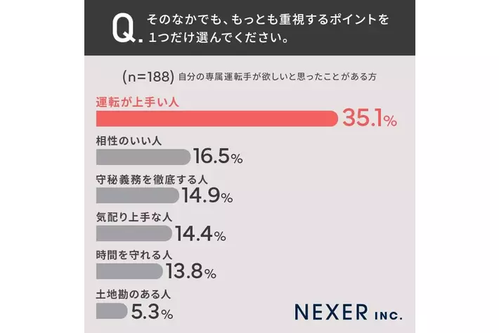 【専属運転手雇うなら...?】35.1%の方が、相性や守秘義務よりも「運転の上手さ」を重視