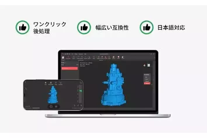 Revo Scan 5は、直感的な操作が可能で、強力な3Dスキャニングおよび編集機能を搭載し、日本語にも対応しているソフトウェアです。iOS、Android、Windows、macOSの各デバイスと幅広く互換性を持ち、STL、PLY、OBJ形式でのデータ出力が可能です。これにより、ほぼ全てのCADや3Dモデリング、スライサーソフトウェアとの互換性が確保されています。