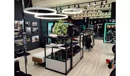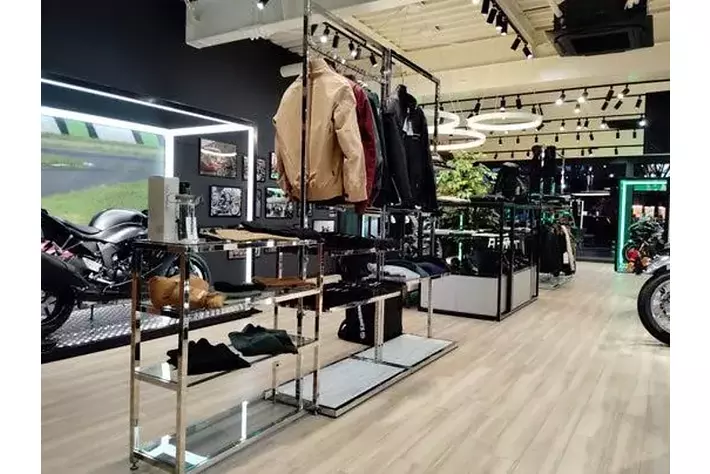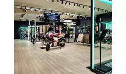 木目調のフロアと白い天井が織りなす明るい店内。モーターサイクルとプラザアパレルがゆったりと展示され、どなたでも楽しめる空間としています。