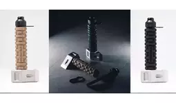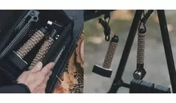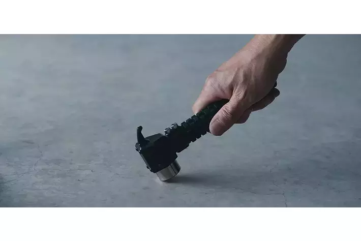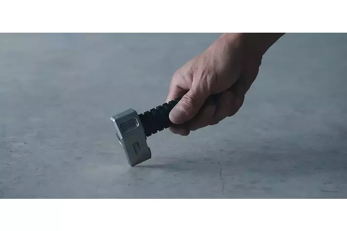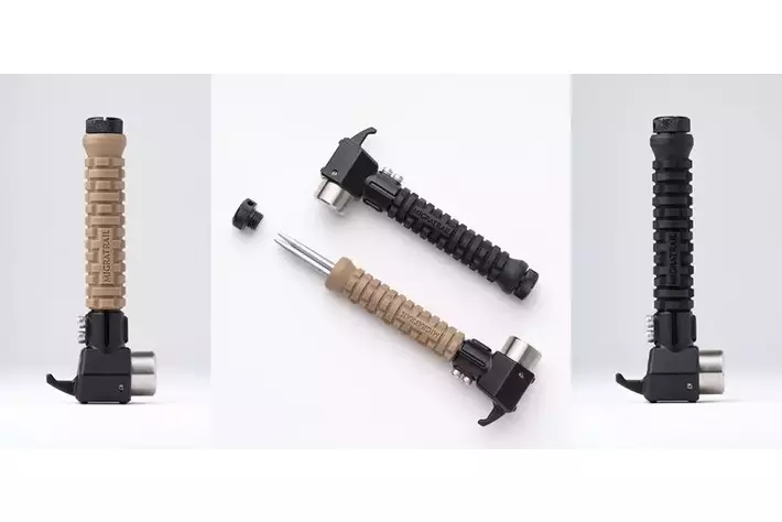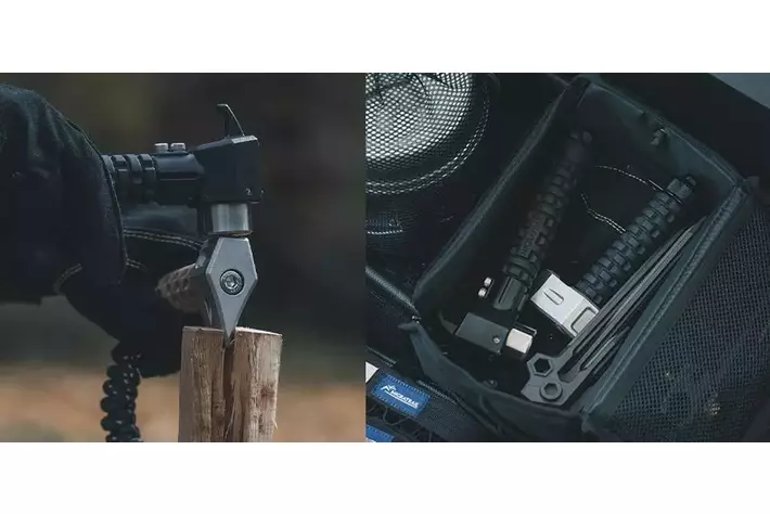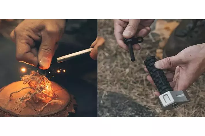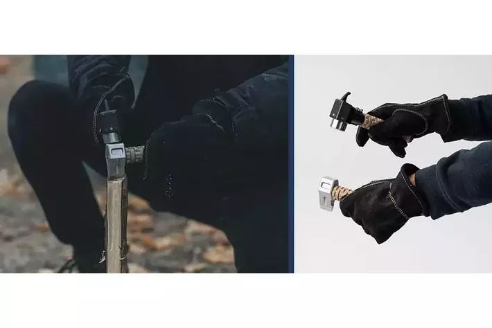 打ち付け部分から持ち手を遠ざけた横型薪割り専用クサビ。軽量かつコンパクトで携帯性に優れる。グリップ内にファイヤースターターを装備。