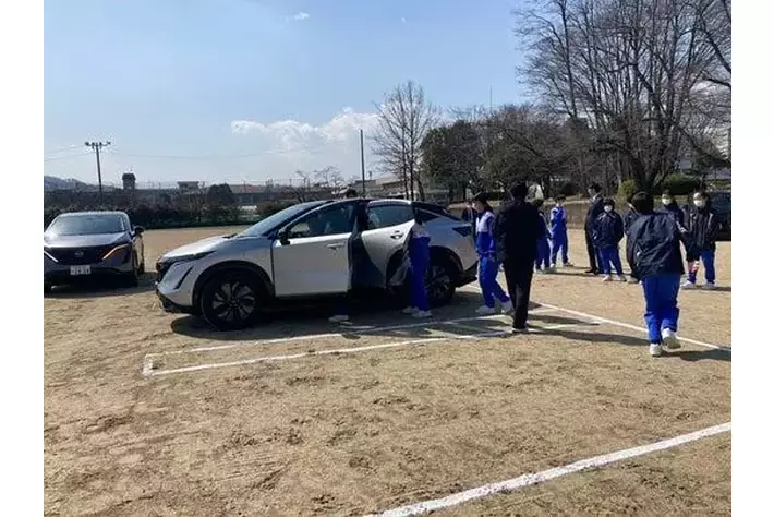 本授業は大きく2部構成となり、1部は日産自動車 カスタマーパフォーマンス&車両性能技術開発本部 法規・認証部 法規・技術渉外グループ 土屋 勝範主管と福島日産 採用育成課 大槻凌之課長による座学講座、2部は校庭に出て電気自動車からの給電デモ体験や、実際に日産アリア・日産リーフ・日産サクラに乗車をしたり、先進技術プロパイロットパーキング(駐車サポート)を体感するなど体験講座式で行われました。
