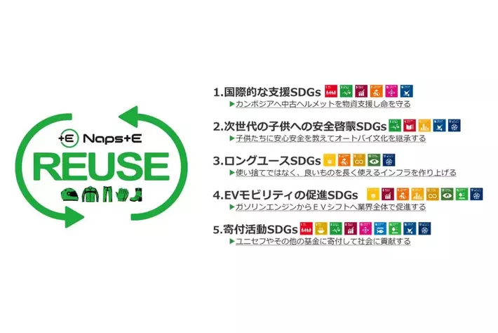 オートバイ用品の小売・開発を行う株式会社ナップス(本社:神奈川県横浜市、代表取締役:望月 真裕 以下、「ナップス」)は、Naps +EのSDGs活動の一環として、お客様がご不要になったオートバイ用ライディングギアを回収し、さまざまなカタチでリユースやリサイクルにつなげる『Naps +E REUSE』の展開をスタートいたします。
