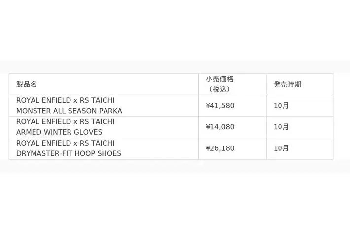 「TAICHIは、ライダーが永くオートバイライフを過ごせるよう、安全かつ快適なウェアを作り続けています。プロテクターはヨーロッパのCE規格を日本国内でいち早く導入し、ウェアの素材は機能性に優れた最先端の素材を採用しています。それによりライダーは動きやすさ、軽さだけでなく、寒暖差の大きい日本において四季を通じて快適に過ごすことができます。ロイヤルエンフィールドとのコラボレーションでは、その洗練されたマシンを彩る装いを提供してまいります」。