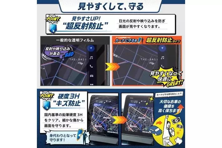 日光の反射や映り込みを防ぎ、画面が見やすくなる超反射防止加工と、細かな傷から画面を守る硬度3Hの傷防止機能付き。