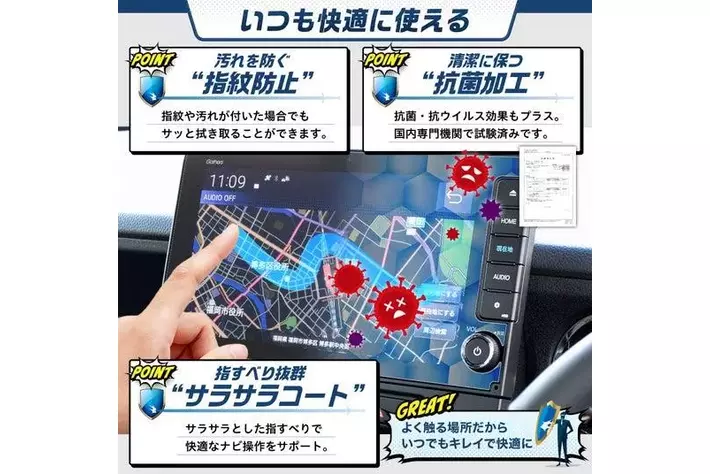 サラサラとした指滑りで快適にナビ操作ができ、指紋や汚れが付いた場合でもサッと拭き取ることができます。