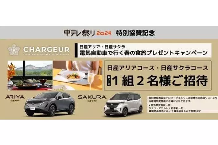 福島日産自動車株式会社(以下福島日産と略、本社:福島県福島市、代表:金子 與志幸)は、2024年3月20日(水)から開催されている中テレ祭り2024への特別協賛記念として、「CHARGEUR(シャルジュール)電気自動車(日産アリア・日産サクラ)で行く春の食旅プレゼントキャンペーン((以下本キャンペーンと略)」の応募を中テレ祭り2024の開催初日に合わせ、20日(水)からスタートしました。本キャンペーンは福島県内にお住いの方を対象としたキャンペーンとなっており、春の食旅を楽しみながら、電気自動車への関心をもってもらうきっかけにと実施しているものです。