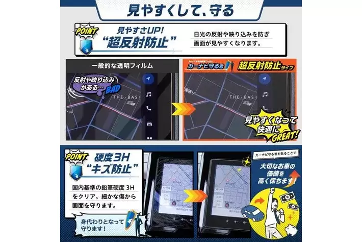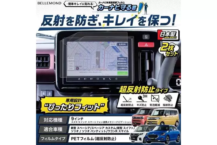 そんな悩みを解決するのが、BELLEMOND(ベルモンド)の『-簡単キレイに貼れる- カーナビ守る君 超反射防止タイプ』。2024年3月に同シリーズから、スズキ 9インチ スマートフォン連携メモリーナビゲーション専用商品が発売されました。